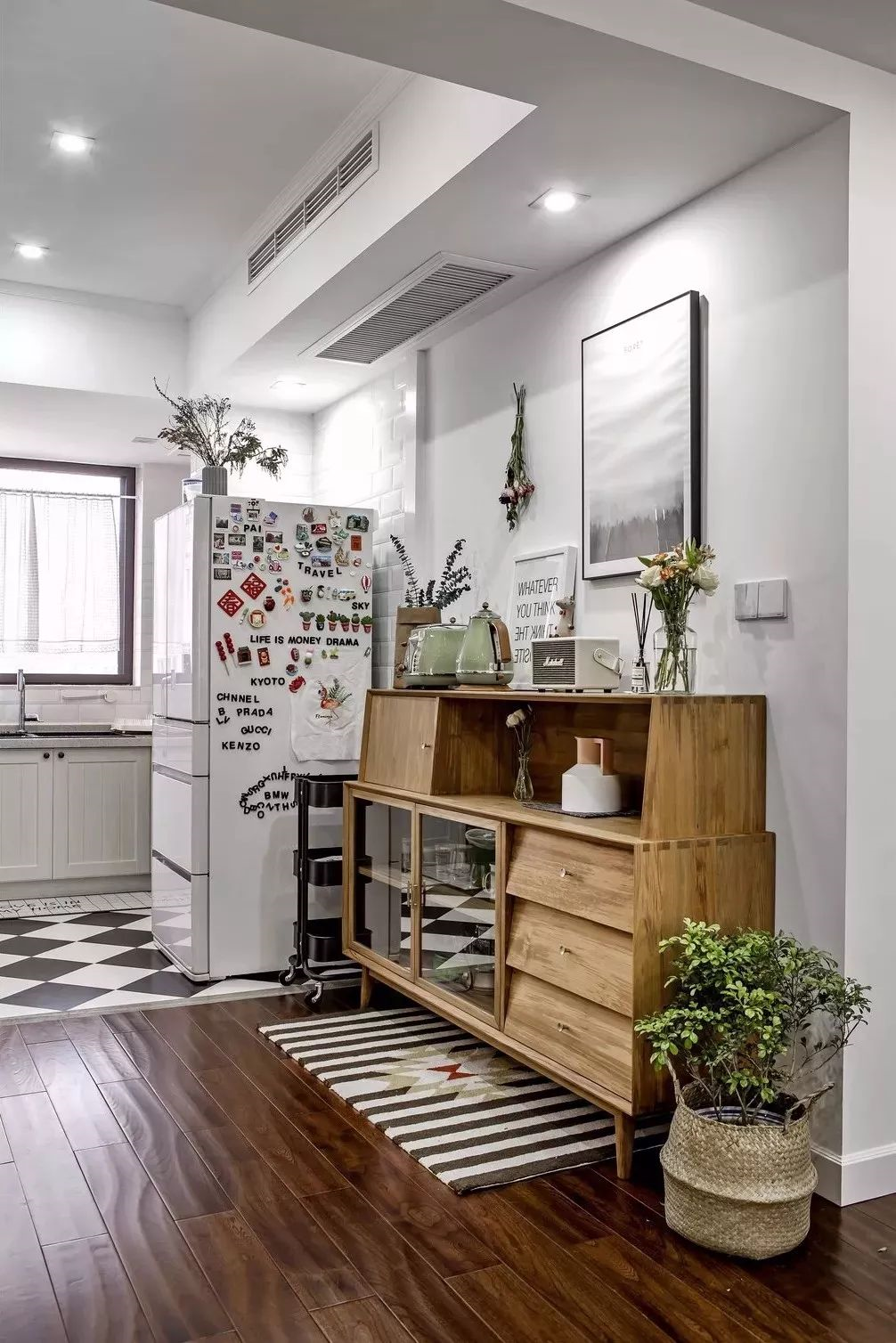 黑白相間的地磚看起來很有格調(diào),整個廚房干凈整潔,并且由于空間格局原因,看起來寬敞。