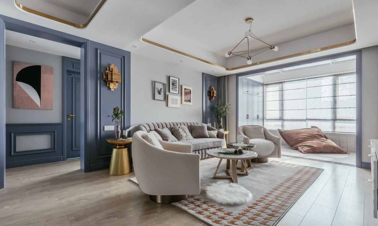 132㎡美式輕奢,墻面藍(lán)色造型,吊頂金屬線框,營造出溫情華麗