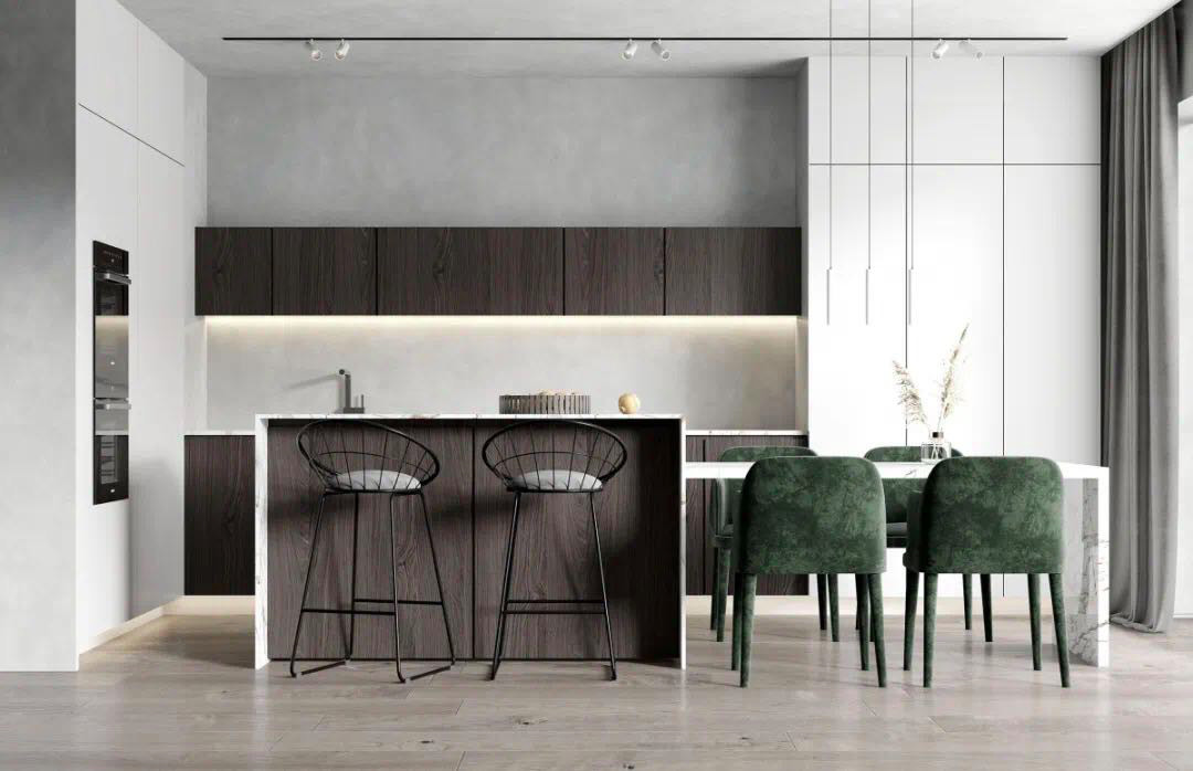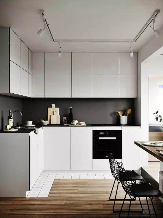 把收納做成隱藏式,柜門(mén)外面可以做無(wú)拉手設(shè)計(jì),即使你家廚房只有幾平米,這樣空間也會(huì)看起來(lái)更寬闊整潔,不雜不亂。