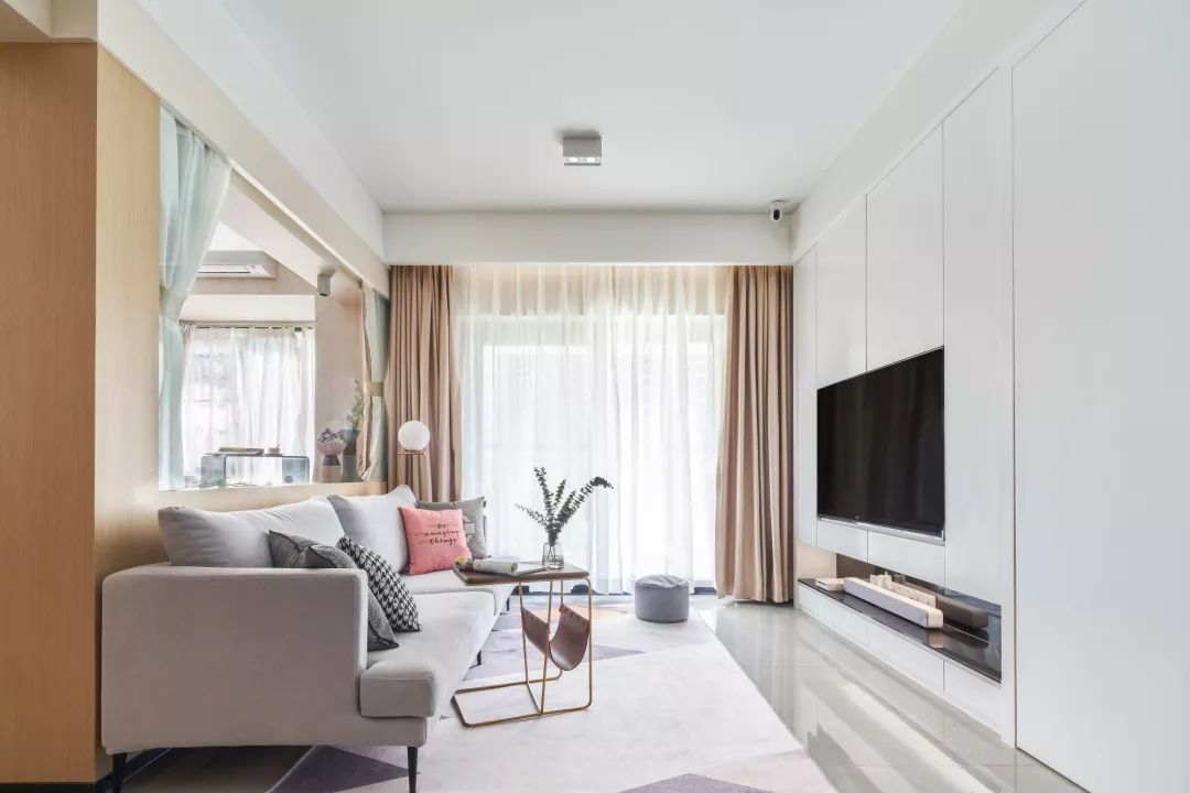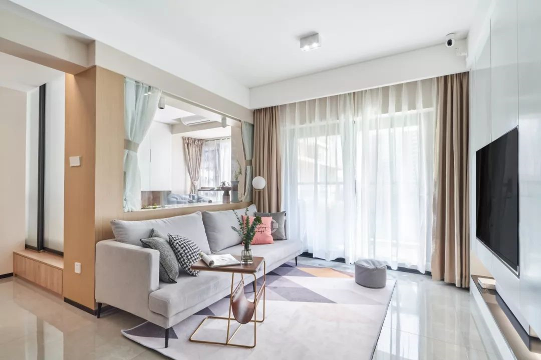 ▲灰色調(diào)的布藝沙發(fā)和彩色的幾何地毯,選擇用邊幾來代替茶幾,很有北歐風(fēng)的感覺??蛷d的后方是榻榻米次臥,用玻璃作為隔斷,看起來更為寬敞和明亮。