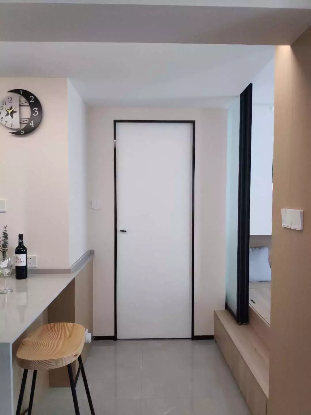 ▲次臥和衛(wèi)生間的門口,一個(gè)臺階通往了次臥,磨砂的玻璃門可以保證采光。藕粉色的墻面搭配白門和黑框,看起來也非常舒服。