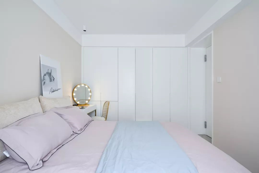 ▲在臥室的另一側(cè)是嵌入式的衣柜,衣柜的邊上擺放一個(gè)梳妝臺,整體白色的柜子加上金屬元素的椅子、鏡子,看起來也非常精致。